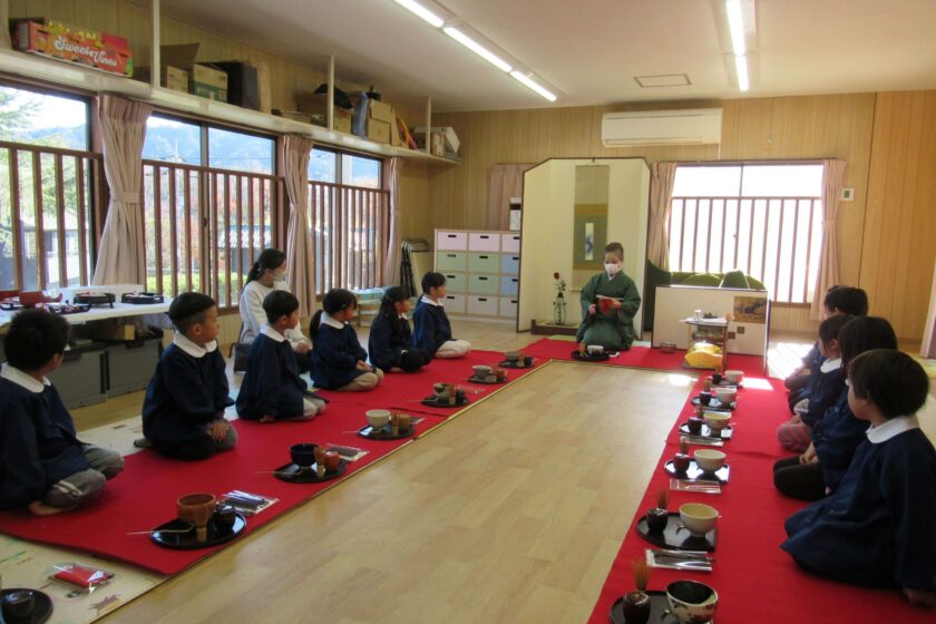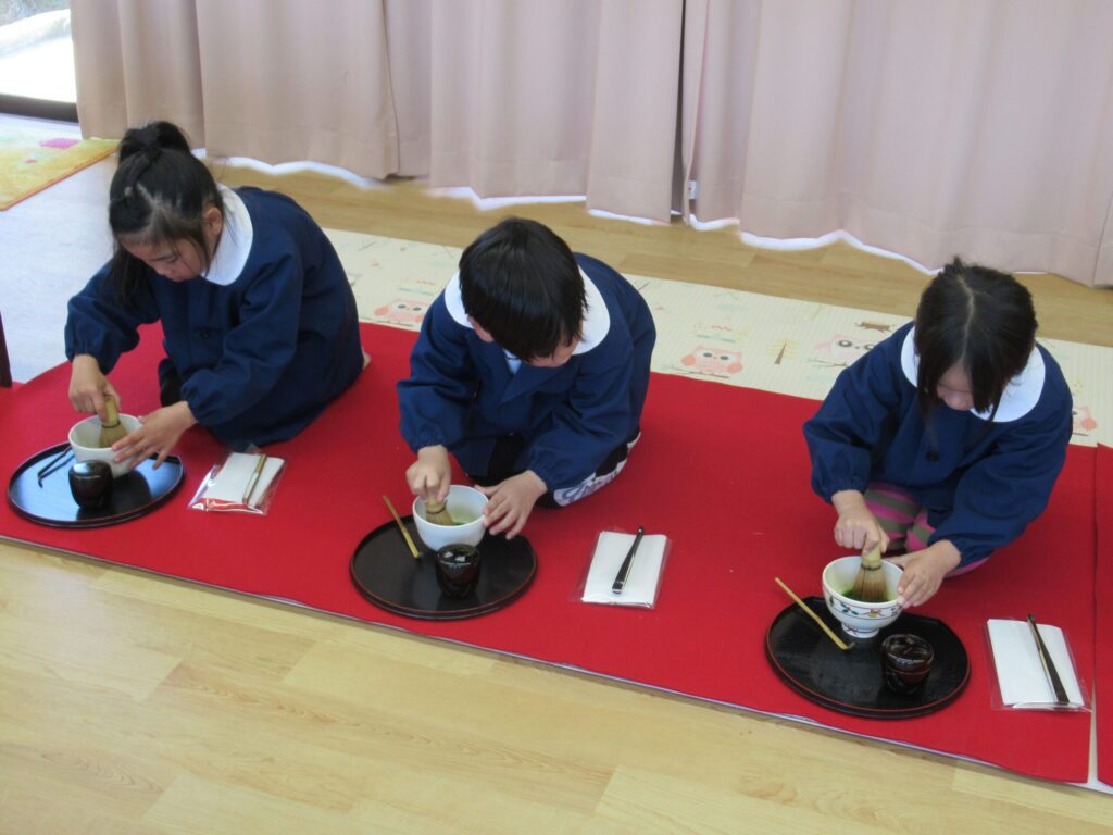 今日は茶道裏千家淡交会第一支部の伊藤先生に来ていただき年長児がお茶会をしました。