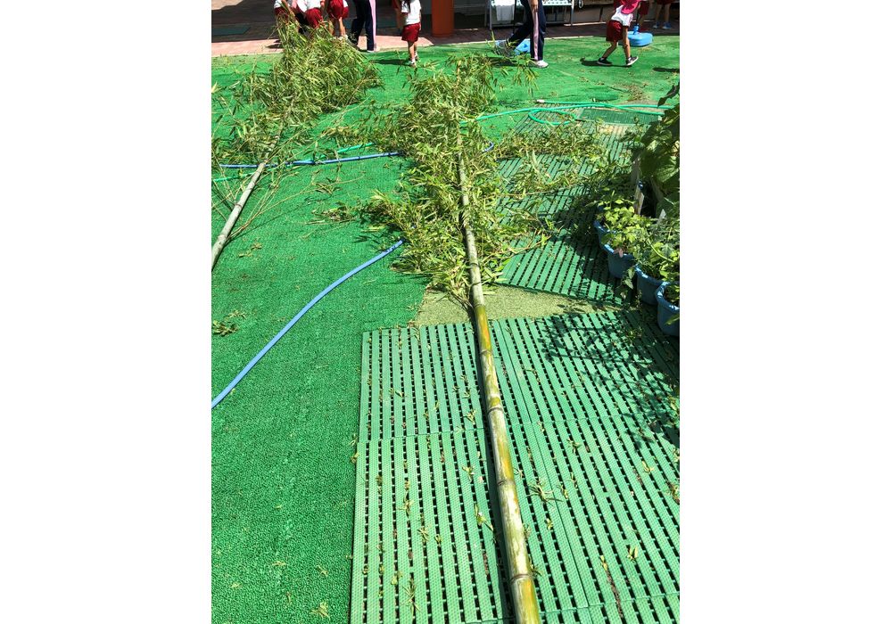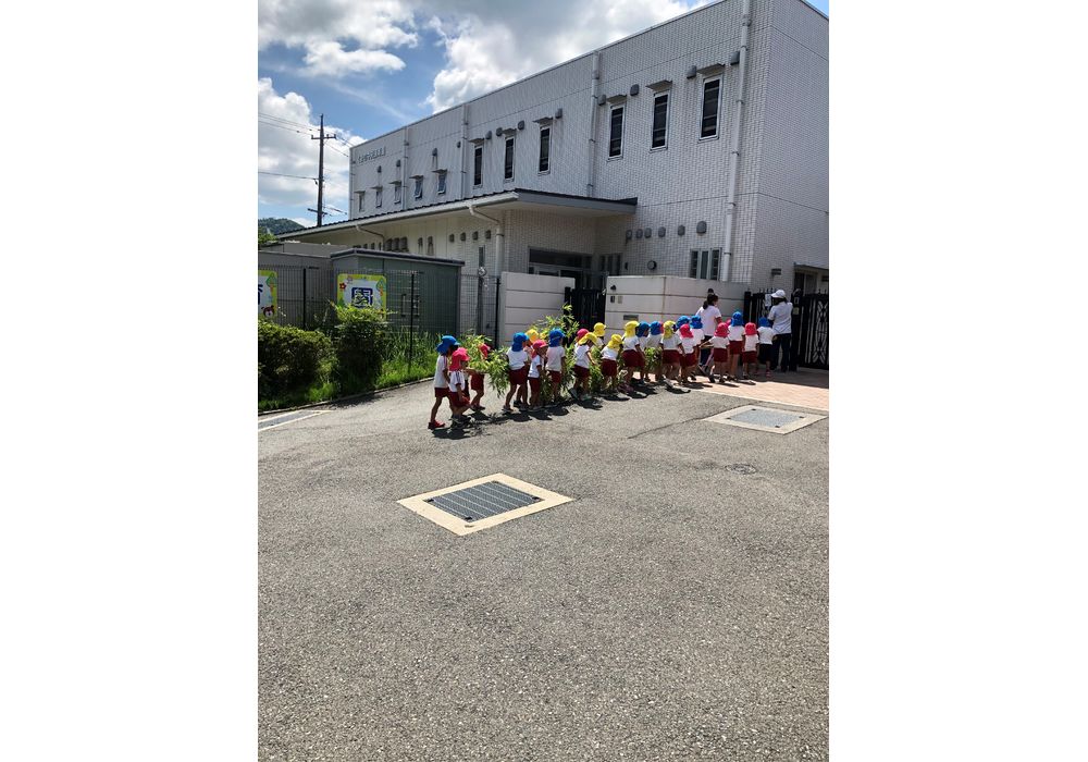 七夕飾りを付ける竹を取りに行って来ました。今年はどんな願い事をするのかな。保護者の方にも願い事を書いてもらってます。
