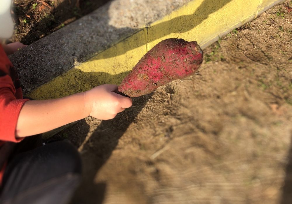 園児さんたちが植えてくれたサツマイモを今日収穫しました。今年は大きく育ちました。土の中から次々と出てくるお芋、宝探しをしているみたいで楽しそうでした。次はビタミンCたっぷりの焼き芋です。自分たちで植えたものを、自分たちで収穫し、自分たちで食べる、楽しみにしておきましょう。