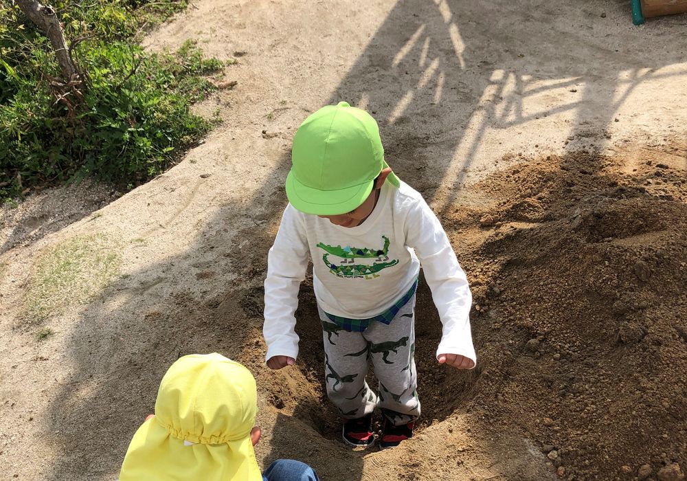 枯れかけた植木を日当たりのよい場所に植え替えようと穴を掘っておりましたところ、当然のごとく園児さんたちが集まってきました。「なんの穴?」「植木の引っ越しする穴、元気になってもらうための引越し」などの会話の後、これも当然のごとく穴に入る子が。。。穴があったら入りたい子どもらしい気持ちですよね。その後植木の引っ越しは無事終わりました。