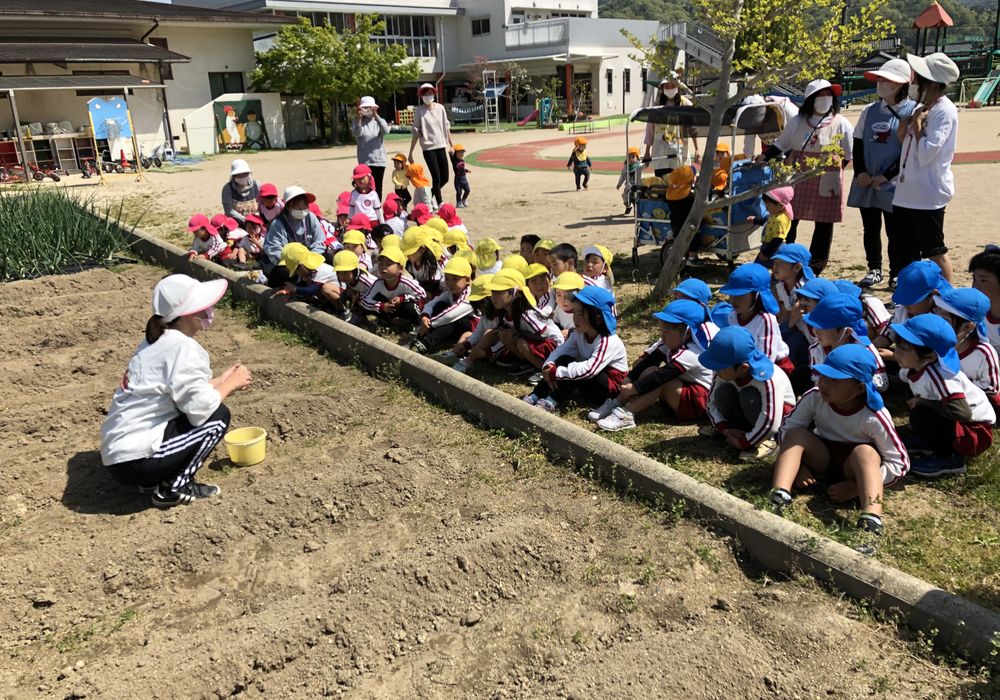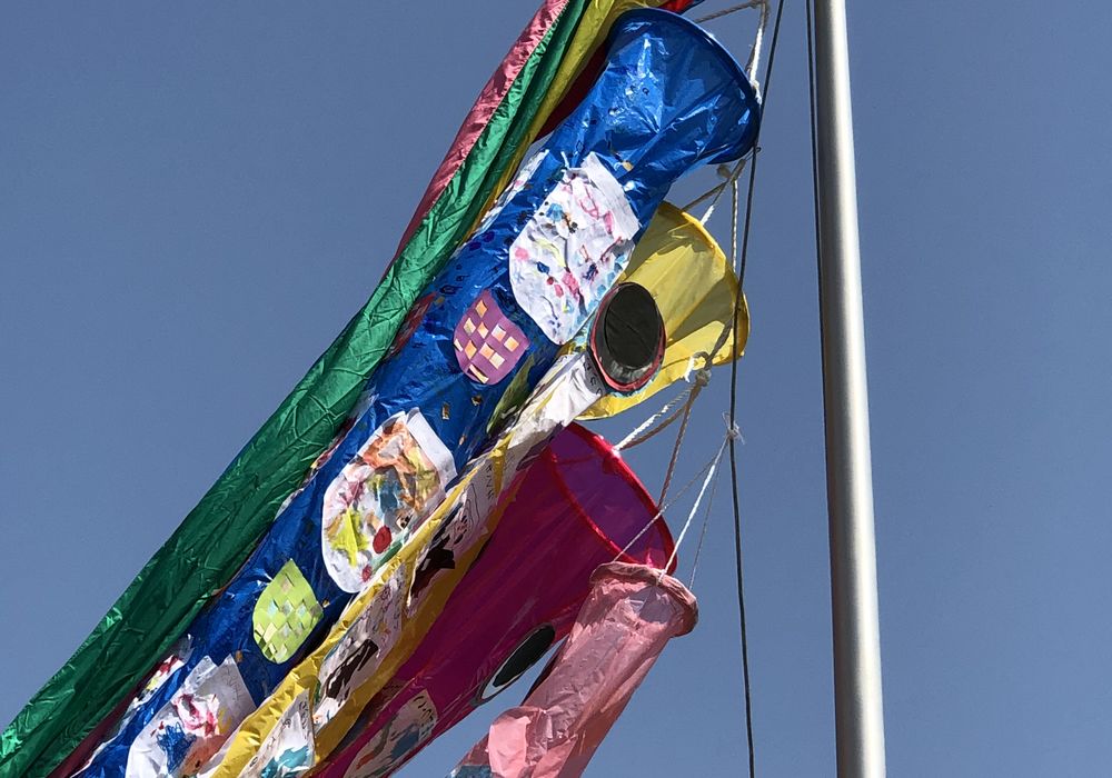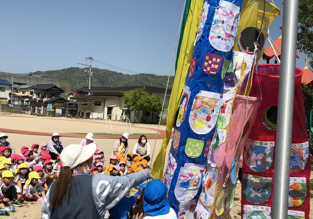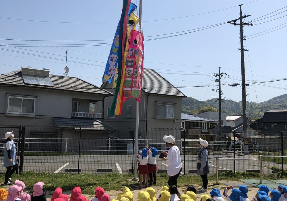 今日はクラスの友達と作ったこいのぼりを揚げて、みんなが丈夫で元気に遊べるよう願いを込めましょう。