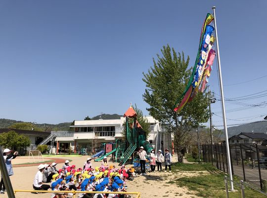 今日はクラスの友達と作ったこいのぼりを揚げて、みんなが丈夫で元気に遊べるよう願いを込めましょう。