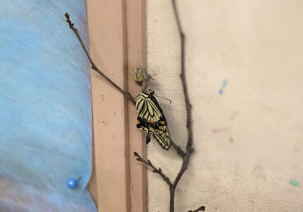 年長さんが部屋にやってきて「先生!蝶々になったよ!」。興奮が伝わってきます。年長さんと一緒に過ごしていた蝶のさなぎから成虫が生まれ?ました。何を感じてくれたのでしょうか。興奮が伝わってきたのであえて何も聞きませんでした。 はつかみこども園 今日の様子 前の記事 「1円玉募金」について 次の記事