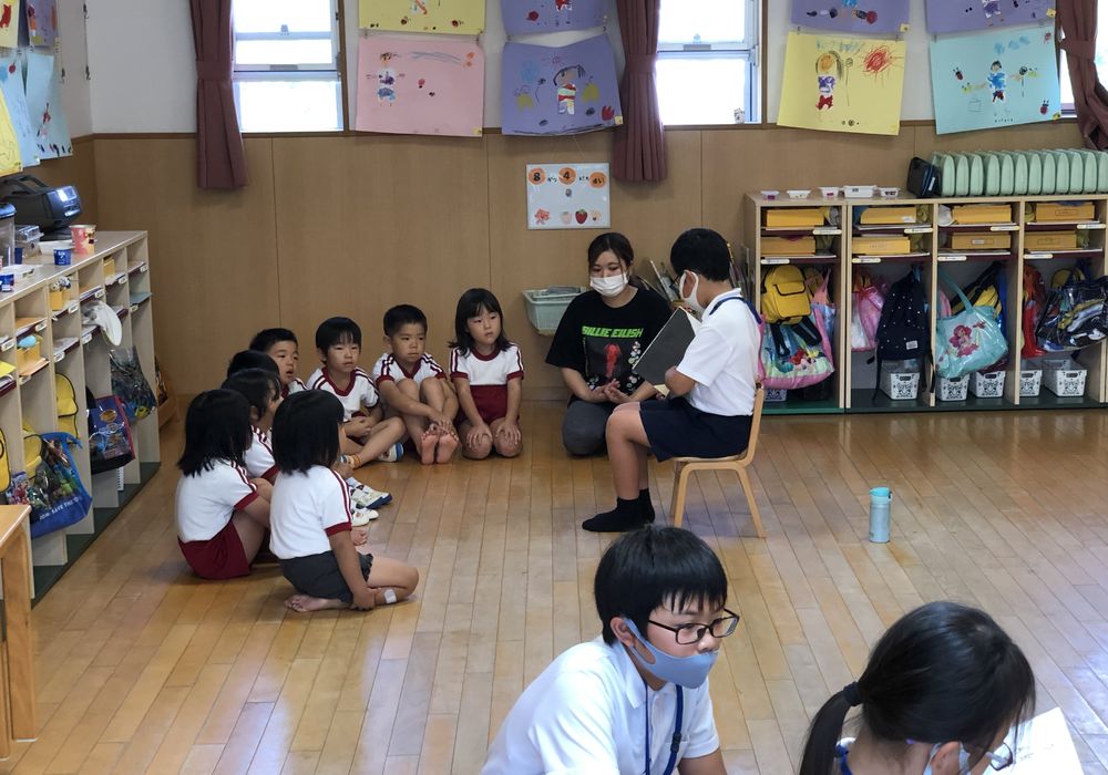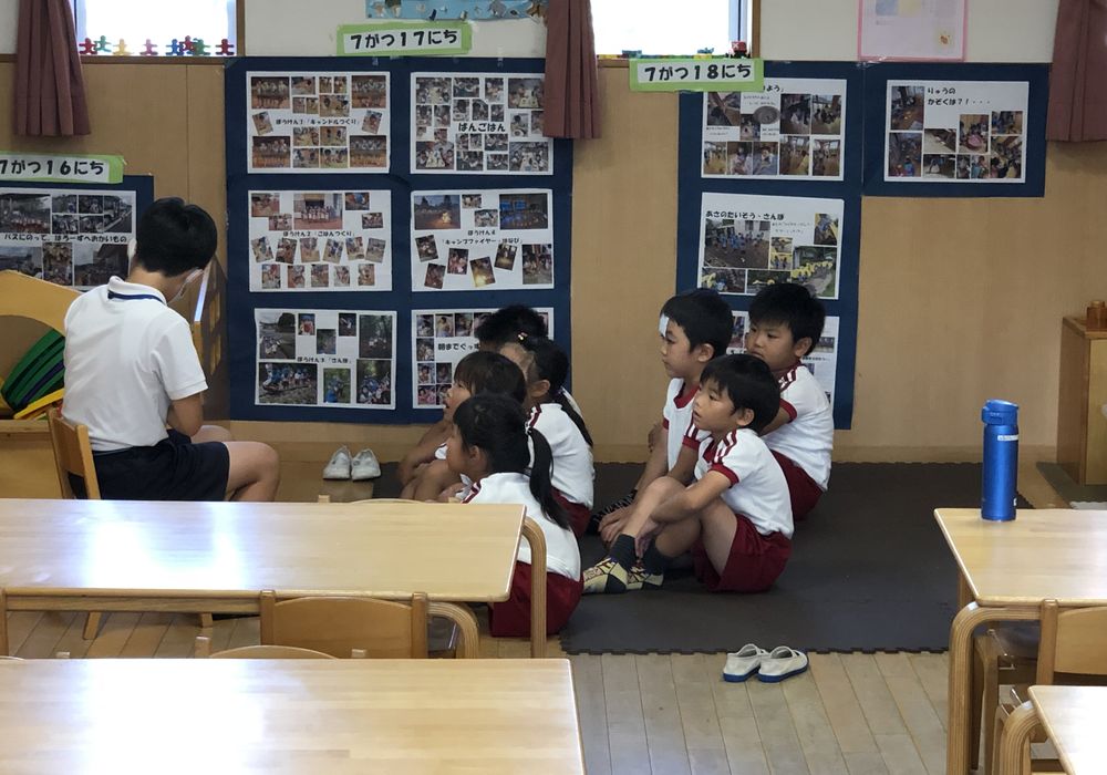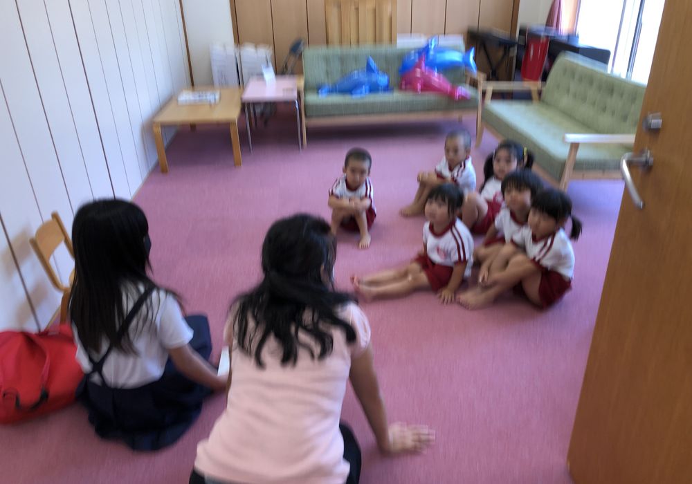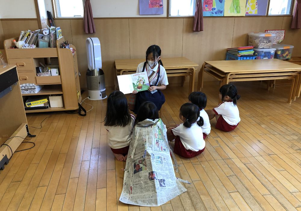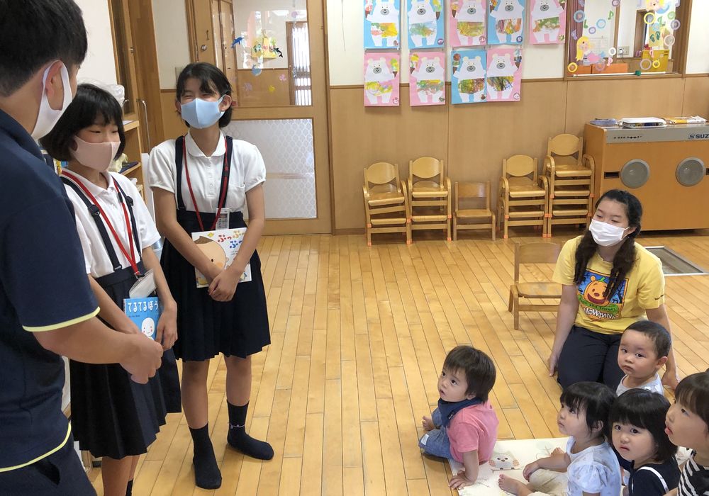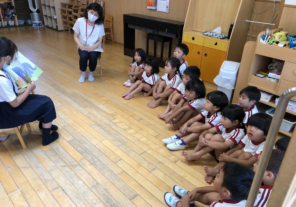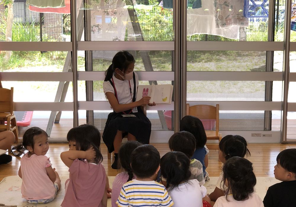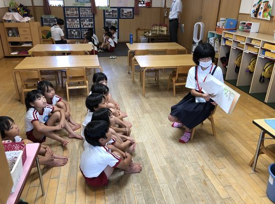 熊野町図書館を中心に活動中の「子ども司書」の小学生が、夏休みを利用してくまの中央保育園を訪問し、子ども達に絵本の読み聞かせをしてくれました。