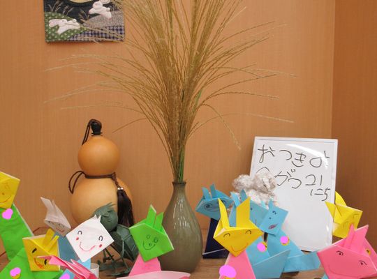 ススキを飾り、折り紙のうさぎ。おだんごもそなえてあります。季節の行事を大切にしながら生活を楽しんでいます。