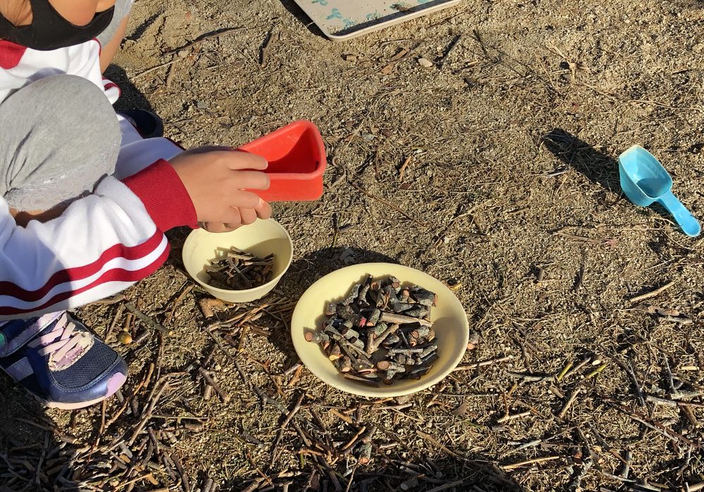 園庭のあちこちで、興味のある一人遊びを深める姿。