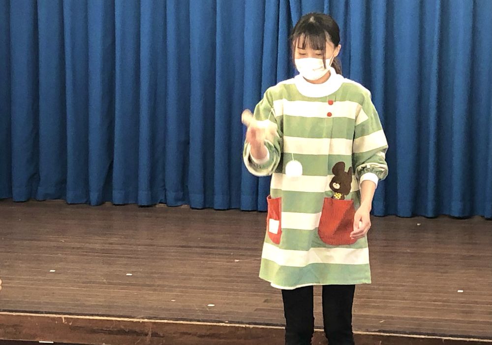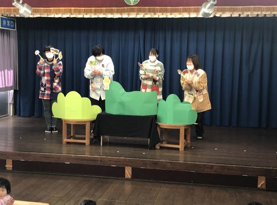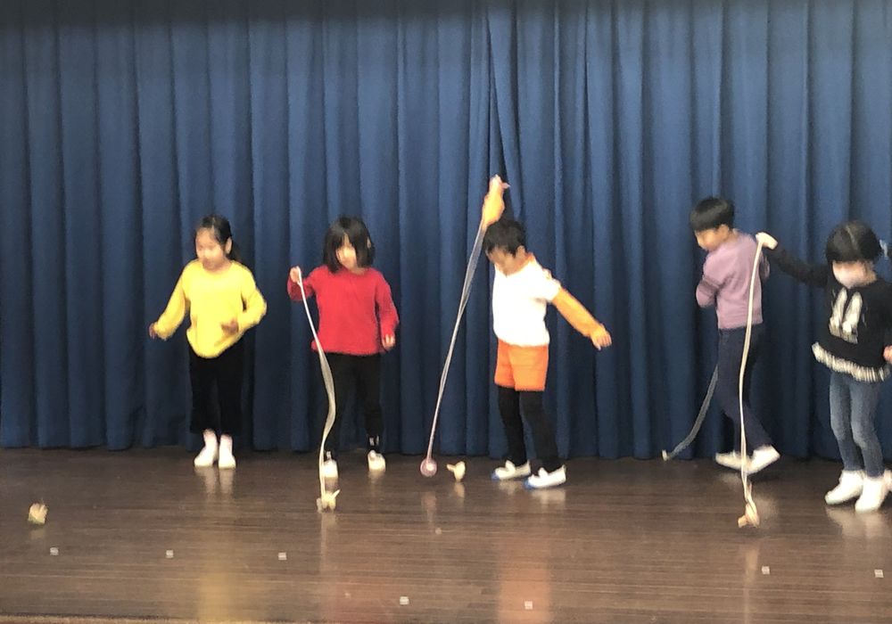 今日ははつかみこども園のお正月をしました。みんなでお正月の唄を歌ったりしたあと、先生がお正月の由来のお話しや、十二支にちなんだペープワートをしてくださり、「舞台大好き年長さん」がコマ遊びの実演をしてくれたり、最後は先生がけん玉遊びを見せてくれたり、とてもワクワクのはつかみこども園のお正月でした。先生のけん玉の技はみんなビックリでしたよ。
