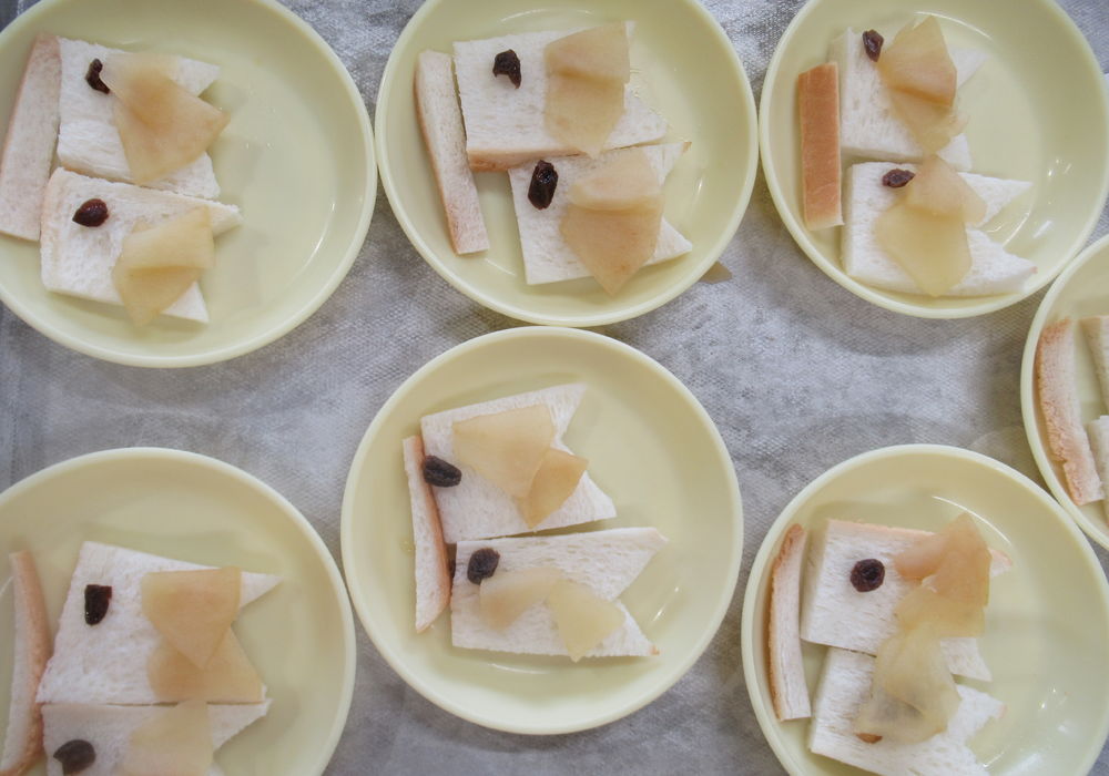 こいのぼりの目はレーズンです。「めめ〜」と言って食べてみるけど・・・「ん?」ペロっとしてみて・・・「うぅぅ〜ん」という顔でした。パイとりんごはおいしく食べました。