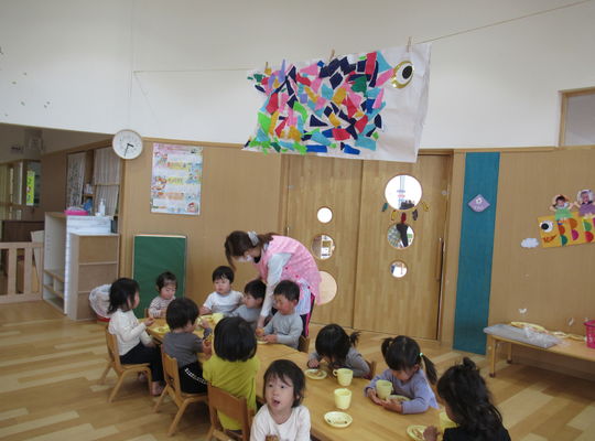 給食は子どもたちの大好きなコロッケ。おやつはこいのぼりのパイです(0.1歳はこいのぼりのパンです)