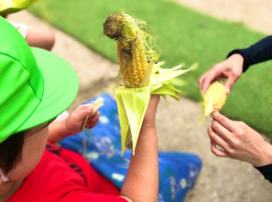 とうもろこしの収穫をしました。今週末のサマーキャンプ(年長お泊り保育)の食材に間に合いました。給食先生にお願いして冷蔵室で大切に保管してもらいました。自分たちで育てたものだから味もさぞ格別になることでしょう。スイカは1週間間に合いそうにありません、残念。別の機会に。