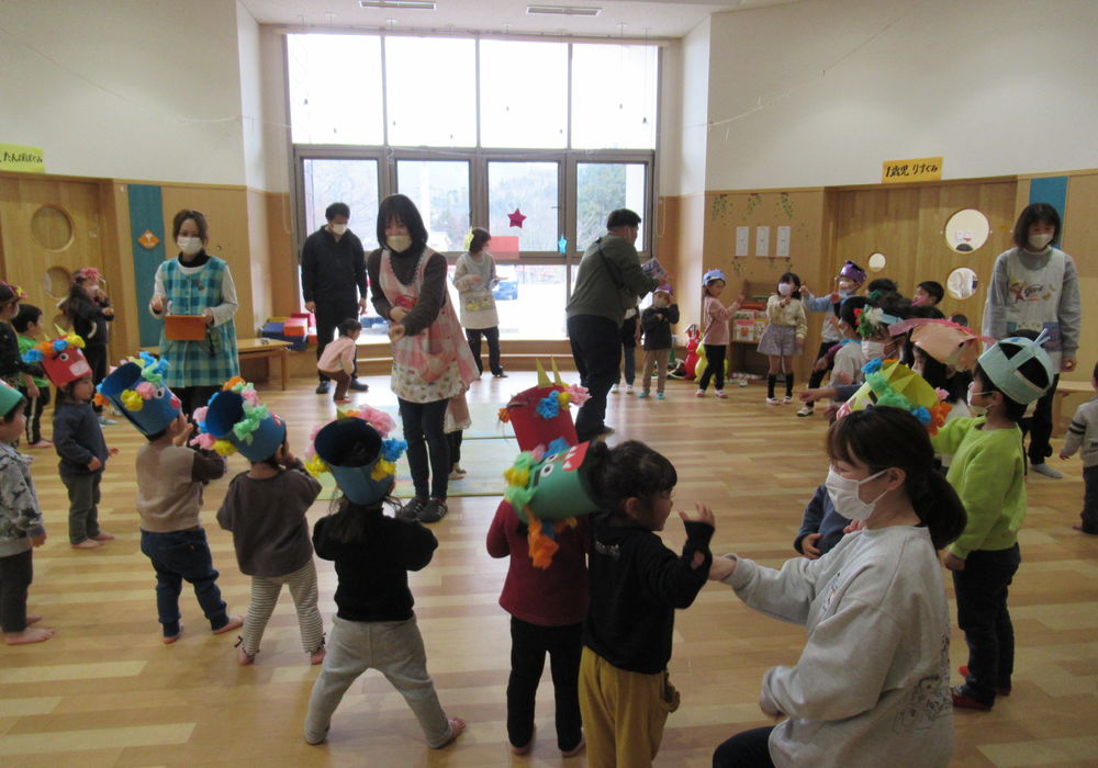 0歳児から年中の各クラスを事前にまわって、どんなことが好きなのか聞きに行き、豆まきの後に歌を歌ったり、かるたをしたりして、小さい子も楽しめるように企画してくれました。