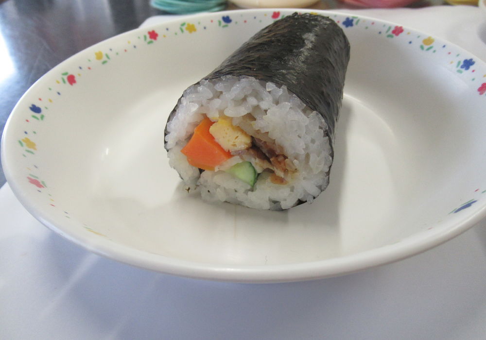 子ども達は巻き寿司をガブリとかぶりつき、黙々と食べていました。鰯のつみれが入ったお汁も飲んで子ども達は大満足のようでした。