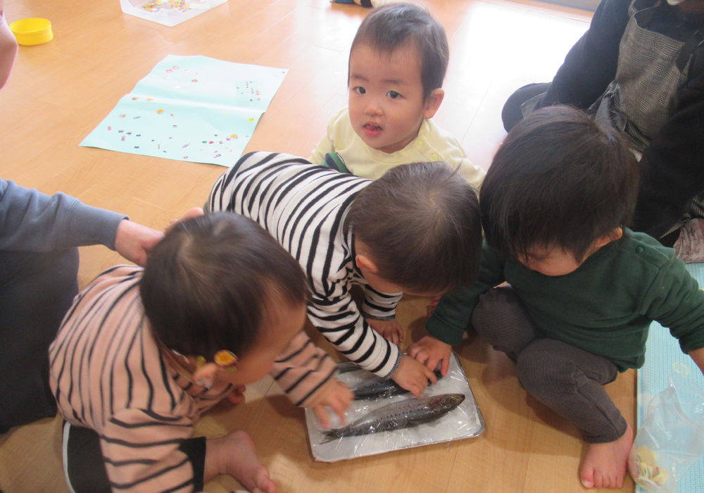 「イワシ」を持ってお部屋に行きました。イワシをつんつんしたり、なでなでしたり、目を触ってみたり、つかんだり、、、興味津々の様子でした。