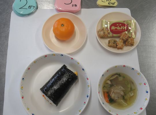 今日は節分。給食のメニューは巻き寿司、いわしのつみれ汁でした。