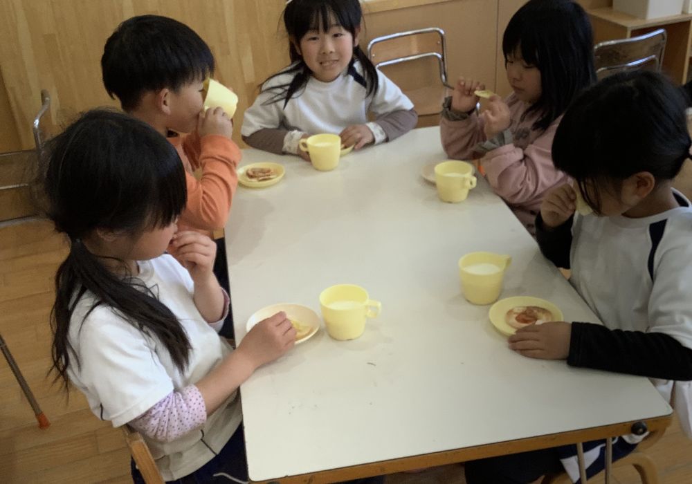今日のピザには、いつもはないウインナーがのっていました。「えっ!今日ウインナーのっとるじゃん!」「カレーがおいしいんよねー」とおかわりをする子ども達でした。