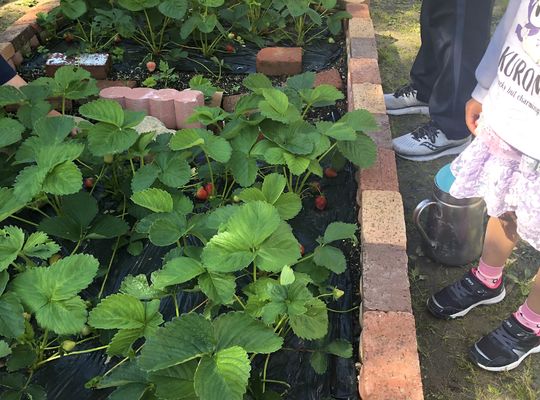 昨秋保護者の方からいただいたイチゴの苗が実をつけはじめました。いちごは強いと聞いていたので、たいした手入れもしなかったのですが、大きく実をつけ始めています。勉強不足だったのですが、かじられたような実があり、保護者の方から「鳥が来てつつくよ、網をした方がいい」と教えてくださったので、鳥対策に早速網をはりました。園児さんたちは実を触れなくなったので、少し寂しそうでした。明日はイチゴの苗をいただいたご家庭のご厚意で年長・年中さんでいちご狩りに行って来ます。