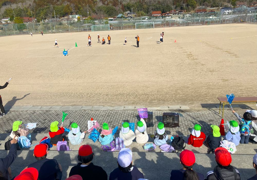 今日は「地域の日」で、年長さんは第二小学校の持久走の応援に深原公園まで行ってきました。昨年までこども園で一緒に過ごしたお兄さん、お姉さんが一生懸命走っているところを、自作の旗で応援しました。来年は君たちも走るんよと教えてあげたら、「今日このあと走る」って園児さんもいました。1年待ってくださいね。