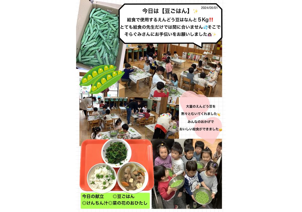 春のお野菜がたくさん出てきました? そらぐみさんおかげで、とってもおいしい豆ご飯ができました? まこと学園 ホームページ こちらでは毎日更新しています? はつかみこども園 お誕生日会 前の記事 はつかみこども園 こいのぼりカレー 次の記事