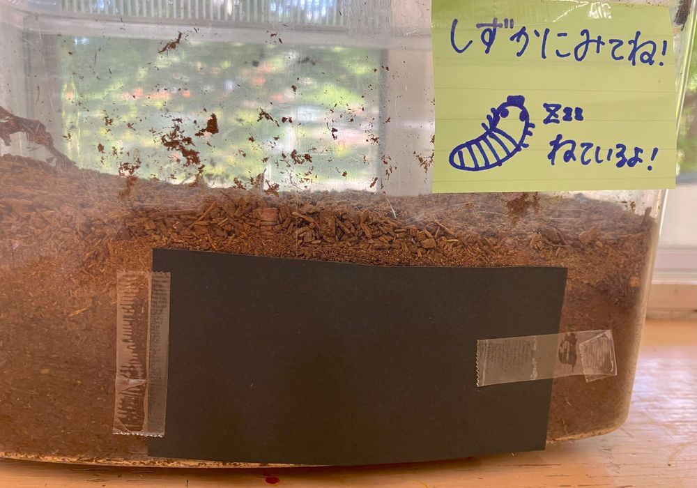 年長さんのカブトムシの幼虫も育ってきました。今、めだか・えび・クワガタを飼っています。大切に育ててください。ダンゴムシは採るだけで楽しんだら逃がしてあげています。ダンゴムシ採集で園庭のいたるところがめくれています。めくった後はもとにもどしましょうね。ダンゴムシさんの帰るところがなくなりますよ。