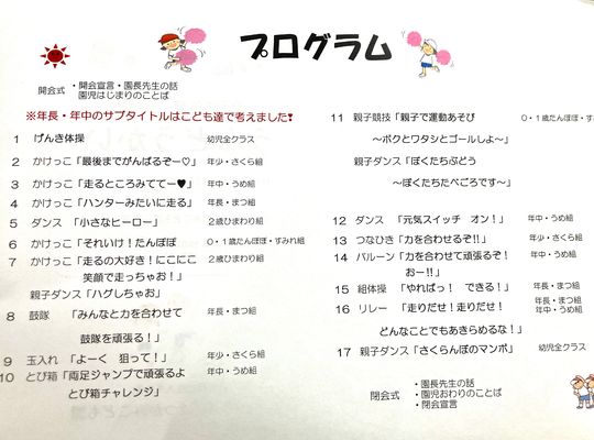 10月19日(土)に運動会を開催します。お天気が心配ですが(なぜか前後土曜日だけが雨予報)楽しみにしている園児さんたちのためにも無事開催できたらと思います。今年も運動会のプログラムができあがりました。昨年から年長さんは自分たちの競技などのサブタイトルを自分たちで考えてくれていますが、今年は年中さんも自分たちでサブタイトルを考えてくれました。タイトルどおり意気込み(ワクワク、ドキドキ)を感じさせてくれます。頑張れ!そして楽しんで!