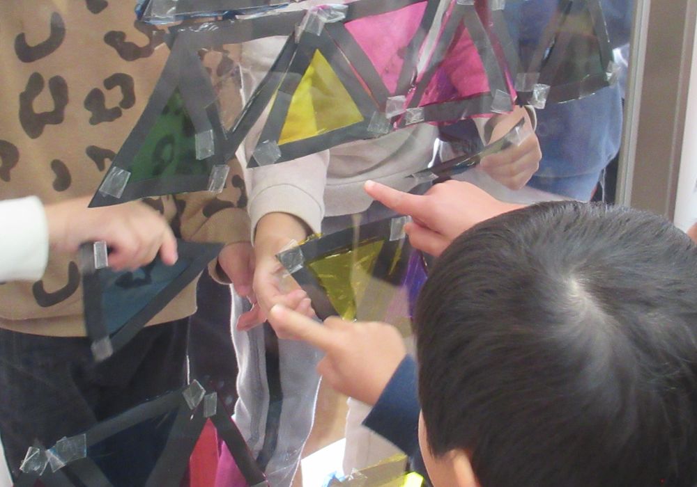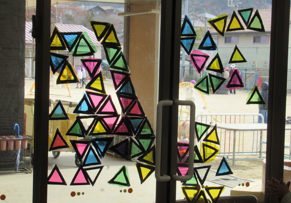 11月の末から3日に分けて制作を楽しみ、今日は最終日。いよいよ作ったものを窓に飾る日です。それぞれに作った三角を窓に貼っていきます。一通り貼り終えたところで窓をみんなで眺めると・・・「わ〜きれい!」という声や「何だか木に見えないな〜??」といった声も。 「隙間を埋めたらいいんじゃない!」と提案の声があがり、窓を挟んで「ここ!ここ!」と声を掛け合いながら隙間を埋め始めました。 「ツリーみたいになってきたね!」と一番上には大きな星が飾られると拍手で喜ぶ子どもたちでした。 簡単に外せるので、また来週には違う形のツリーに変身するのでは…?と楽しみにしています。