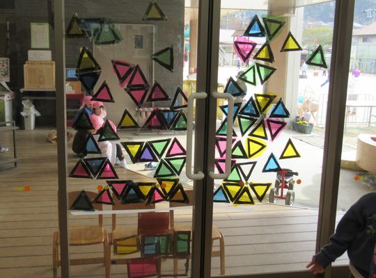11月の末から3日に分けて制作を楽しみ、今日は最終日。いよいよ作ったものを窓に飾る日です。それぞれに作った三角を窓に貼っていきます。一通り貼り終えたところで窓をみんなで眺めると・・・「わ〜きれい!」という声や「何だか木に見えないな〜??」といった声も。 「隙間を埋めたらいいんじゃない!」と提案の声があがり、窓を挟んで「ここ!ここ!」と声を掛け合いながら隙間を埋め始めました。 「ツリーみたいになってきたね!」と一番上には大きな星が飾られると拍手で喜ぶ子どもたちでした。 簡単に外せるので、また来週には違う形のツリーに変身するのでは…?と楽しみにしています。