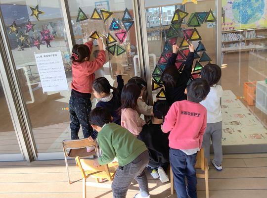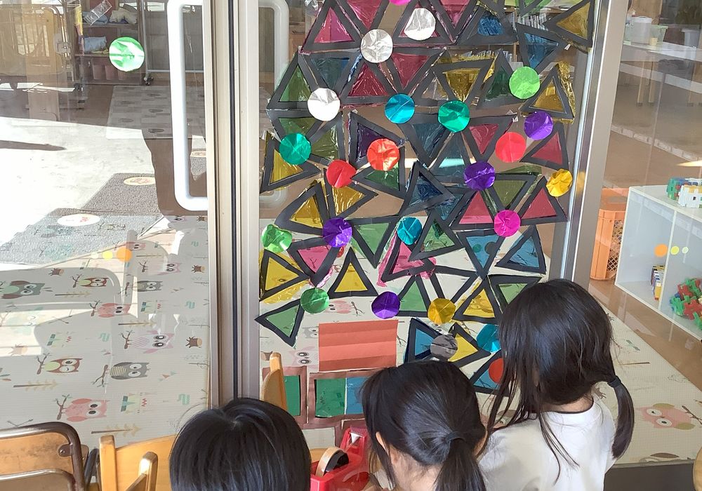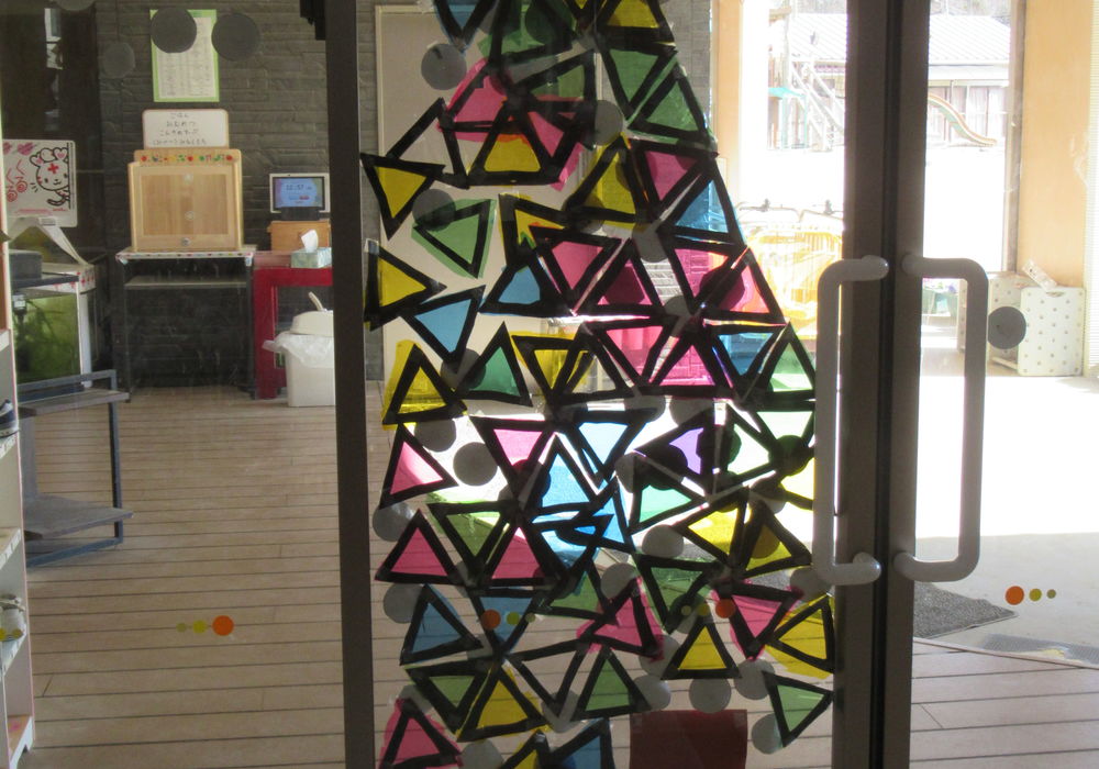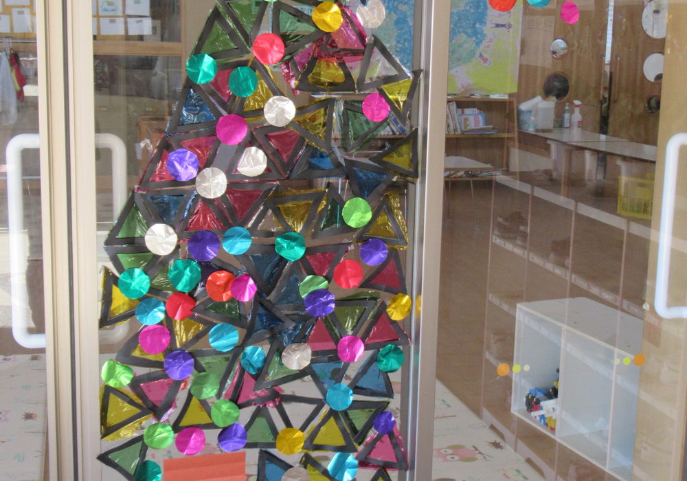 「木と幹の間が空いてる!どうする?」「横の三角を動かしたらいい!」ということになり、ツリーの形が変わりました。 出来上がった木に丸く切った折り紙の飾りをつけて完成!! 「あと2回寝たらサンタさん来る!」とクリスマスを心待ちにしている子どもたちです。