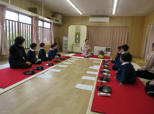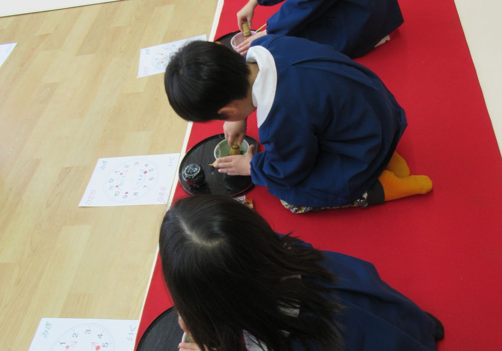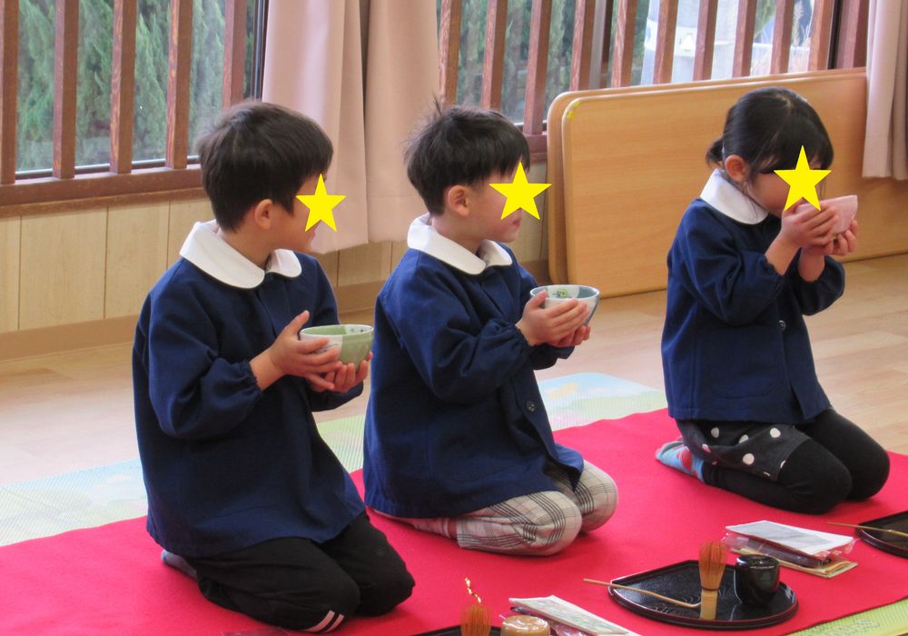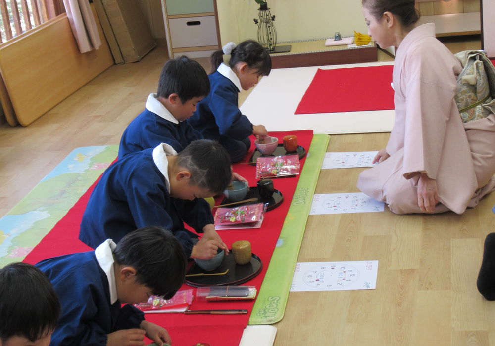 今日は年長さんがお茶会をしました。 裏千家広島第一支部 伊藤宗雄・宗久先生に来ていただき、道具の名前や使い方を教えていただき、お菓子を食べ、自分で抹茶をたてました。 先週、園長先生から道具の名前を教えてもらっていたので、「これは何でしょう?」と聞かれて大きな声で答える姿もありました。「初めてだから抹茶をちょっとにしてほしいな」と自分の思いを伝え、「おいしかった!」「にがかった?」とそれぞれに楽しみました。