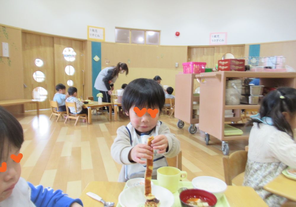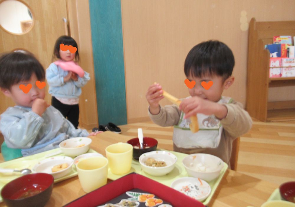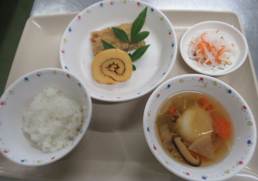 松風焼き、伊達巻き、紅白なます、お雑煮(幼児)です。おせち料理はお重にいれました。お重の中からお皿に入れてもらい、いつもと違う様子に子どもたちは嬉しそうです。伊達巻きが大人気でした。食べ始めると、一番に食べる子が多かったです。