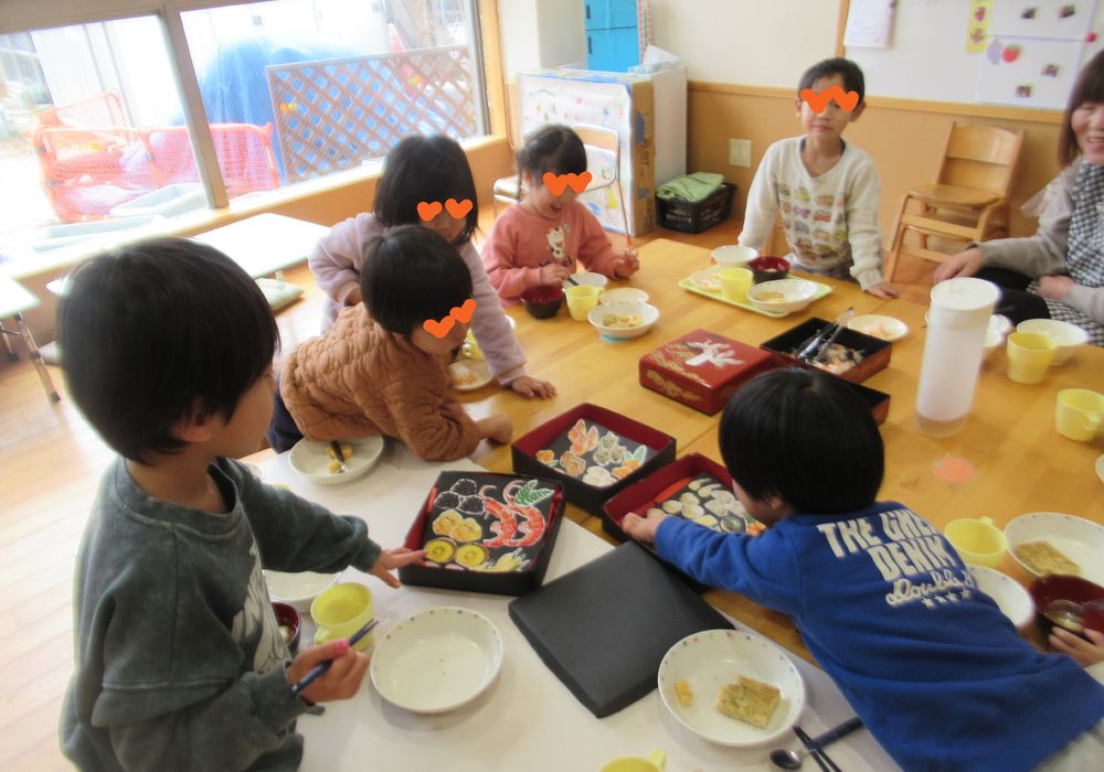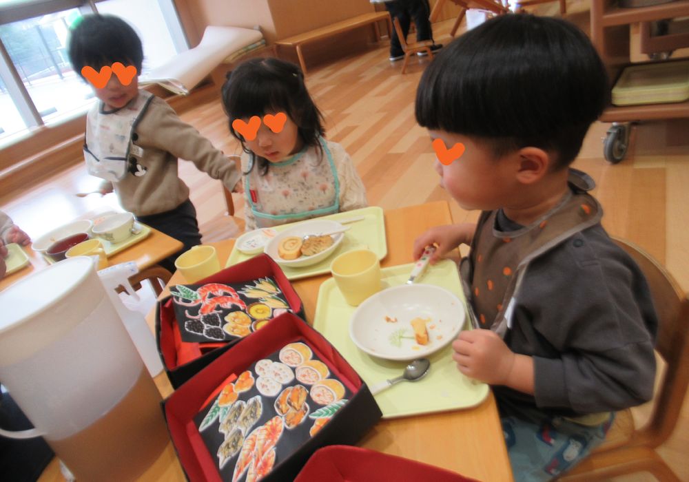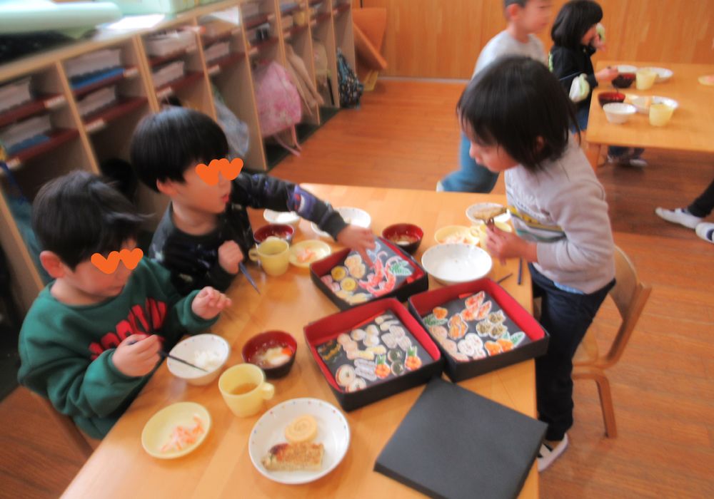 絵で作ったおせちを見て「ばーちゃん家で食べたよ」「えび食べたよ」「かまぼこが好きだった」とお正月のお話をしてくれる子達もいました。「これは何?」と見た事のないものを指さしたり、人参がお花の形になっていたり、こんにゃくが飾り切りしてあるのを見て「何でこんなかたちにするん?」と興味津々でした。