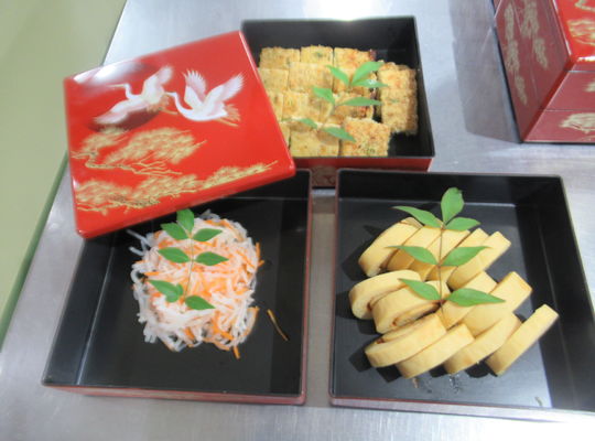 絵で作ったおせちを見て「ばーちゃん家で食べたよ」「えび食べたよ」「かまぼこが好きだった」とお正月のお話をしてくれる子達もいました。「これは何?」と見た事のないものを指さしたり、人参がお花の形になっていたり、こんにゃくが飾り切りしてあるのを見て「何でこんなかたちにするん?」と興味津々でした。