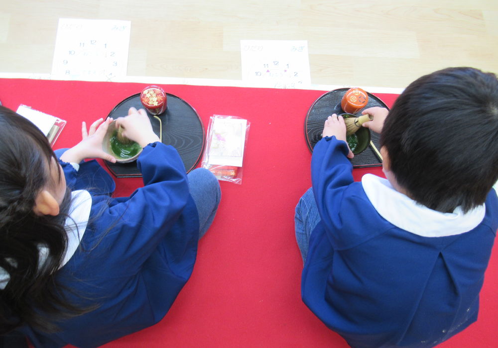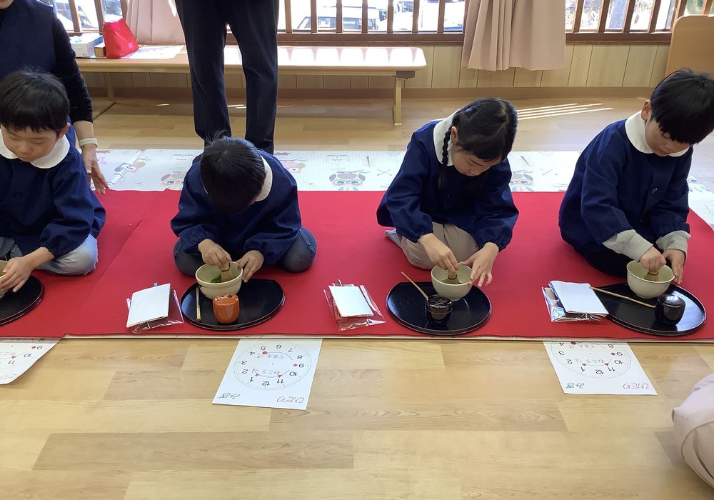今年度2回目のお茶会をしました。 2回目ということで、道具の名前や作法を覚えている子もいました。 お茶をたてる時、「手伝わんでいいよ。自分で出来る!やってみる!」と真剣な表情の子どもたち。手つきも様になり、おいしいお抹茶がたてられました。日本の文化に触れられるのはいいですね♪