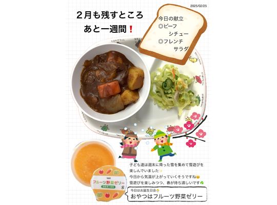 今週はなんだかボリューミーな献立でした?? 春に比べてどのクラスも食べる量が増えました? 明日から3月!年長さんは保育園生活ラスト1か月、しっかり楽しんでほしいと思います? まこと学園 ホームページ こちらでは毎日更新しています? お茶会 2 前の記事 ひかり学園 ひな祭り 次の記事